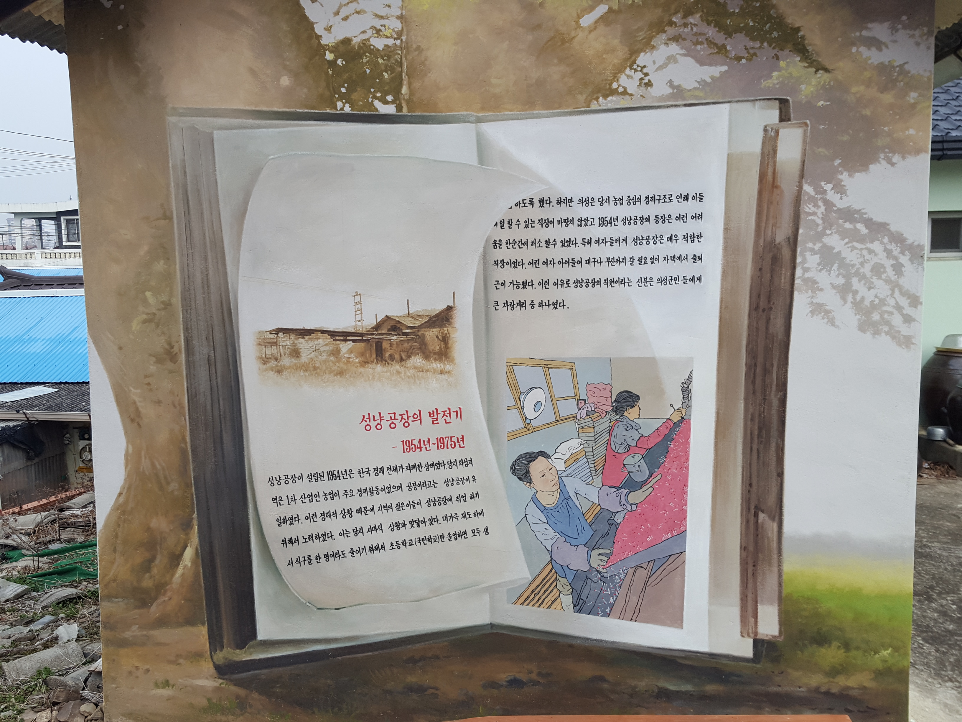 성냥의 주요재료였던 느티나무 숲속의 성냥공장 이야기를 벽화로 표현
