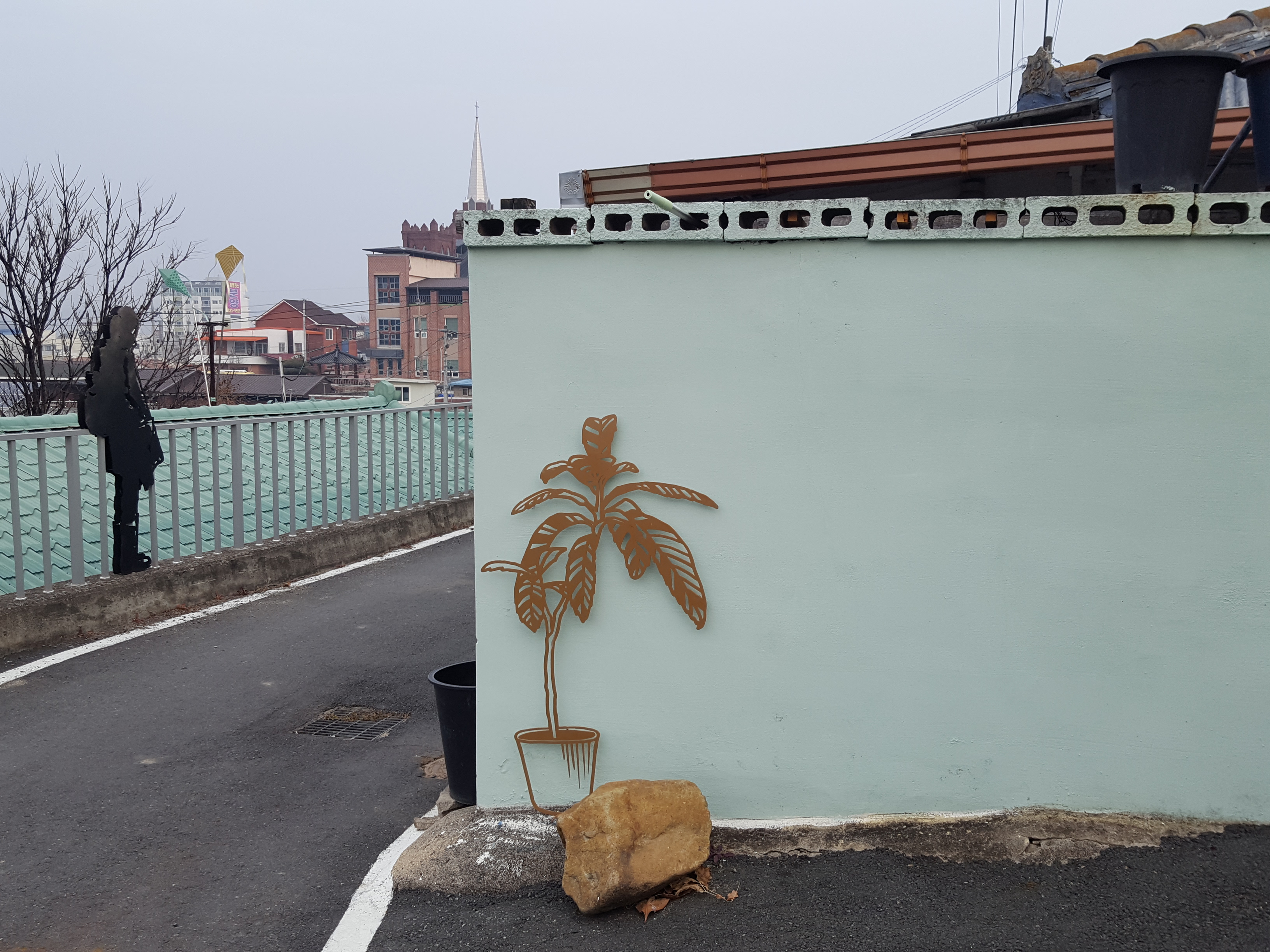 성냥공장 방향의 후 골목으로 1차년 지역조사의 내용을 토대로 벽면 작업화, 성냥 우측 공장 우측 골목으로 블록벽의 사각 프레임을 활용하였고 지역조사의 기초자료 중 성냥공장, 마늘 등의 내용을 작품화